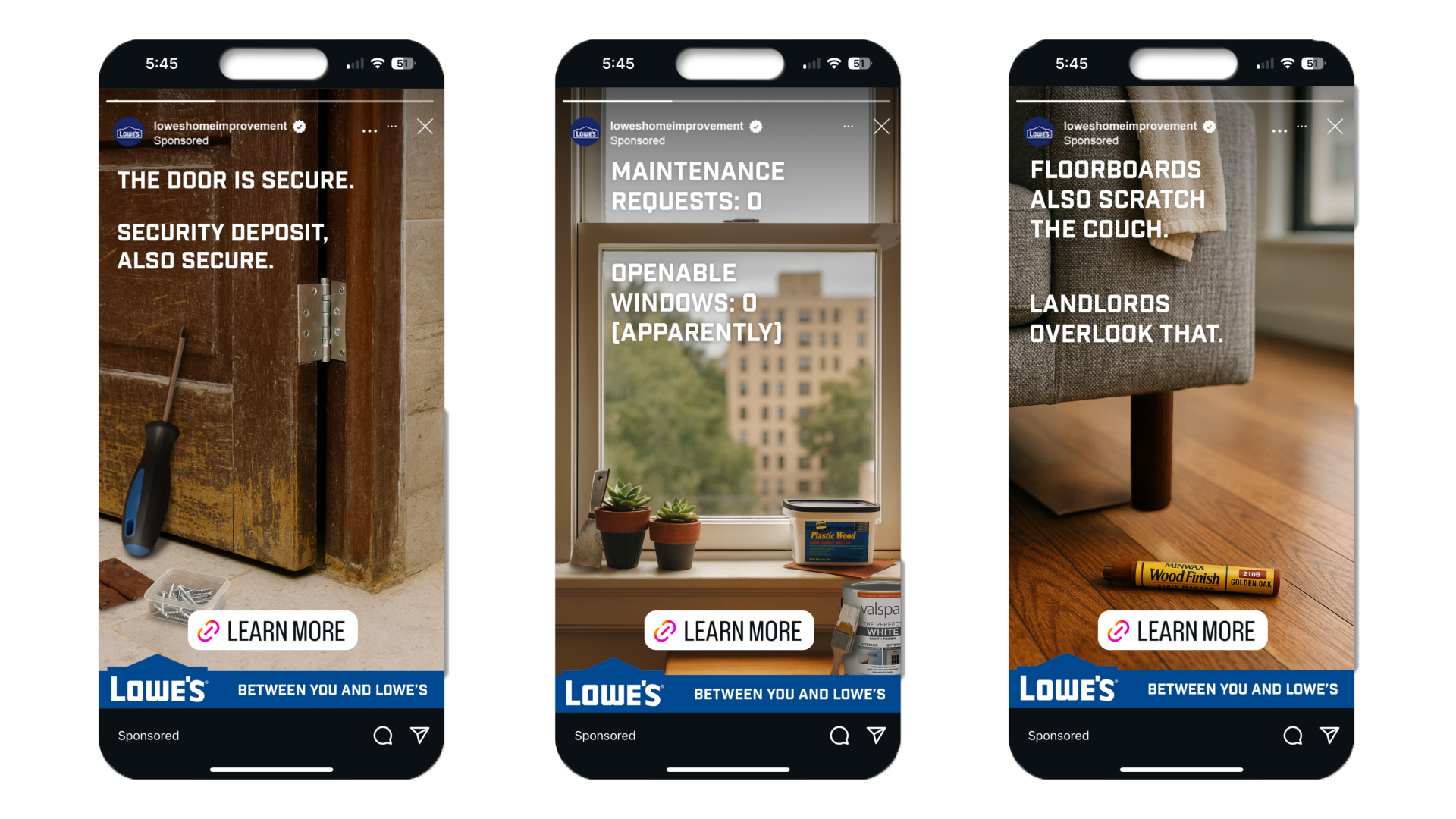 Between You and Lowe’s Lowe’s believes those messes don’t have to be other peoples’ business For renters, home isn’t always where the heart is.But it’s where they live. And life get’s messy. Share your trouble on social, and we’ll help sweep it under the rug. We understand accidents (Unlike your landlord). Then we sought out a partner.An unbelievable individual to deliver a message of hiding the unbelievable Lowe’s gets people through stressful mishaps. Like they never happened. Tragedy strikes at any time.So will Lowe’s helping hand.