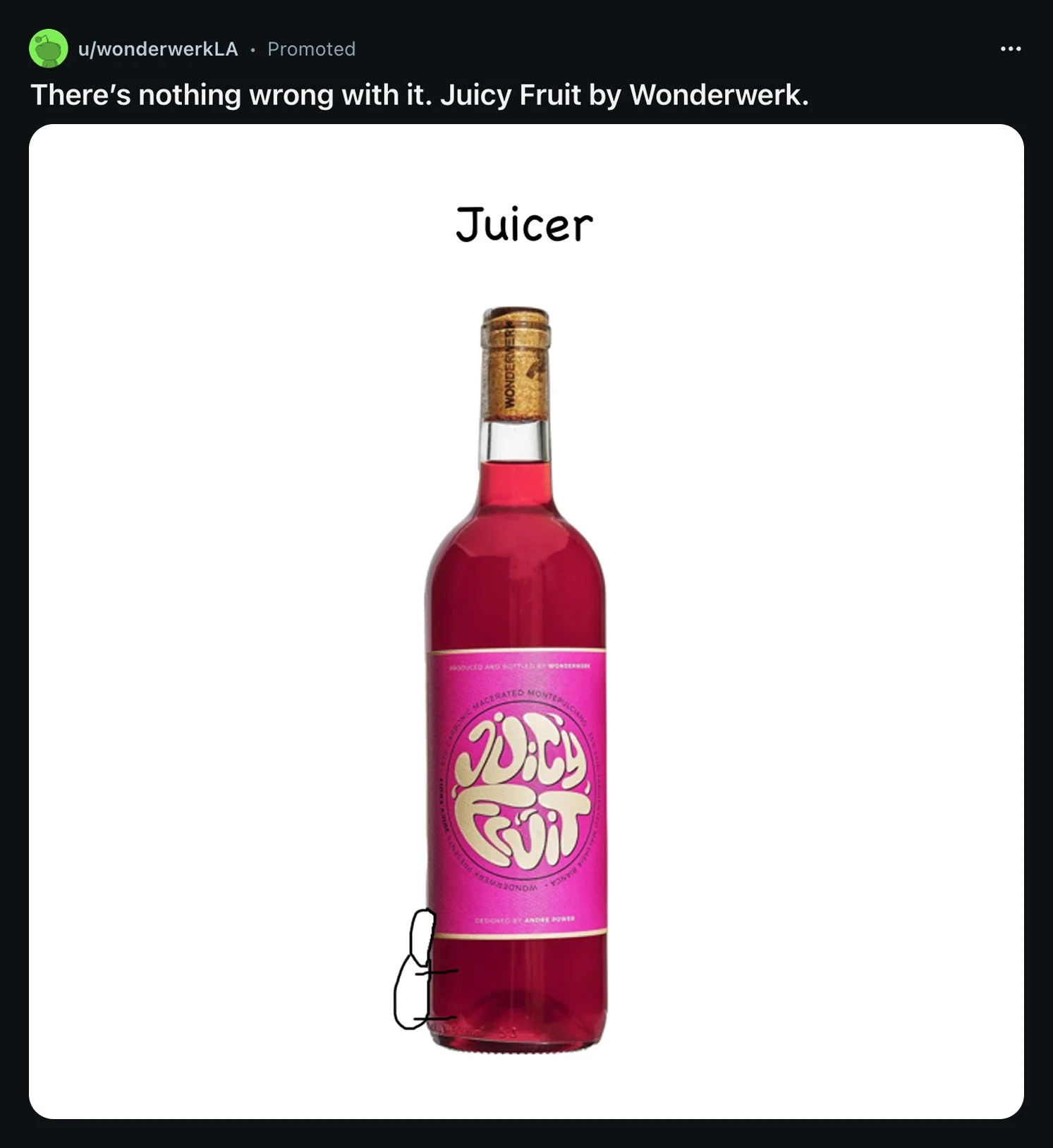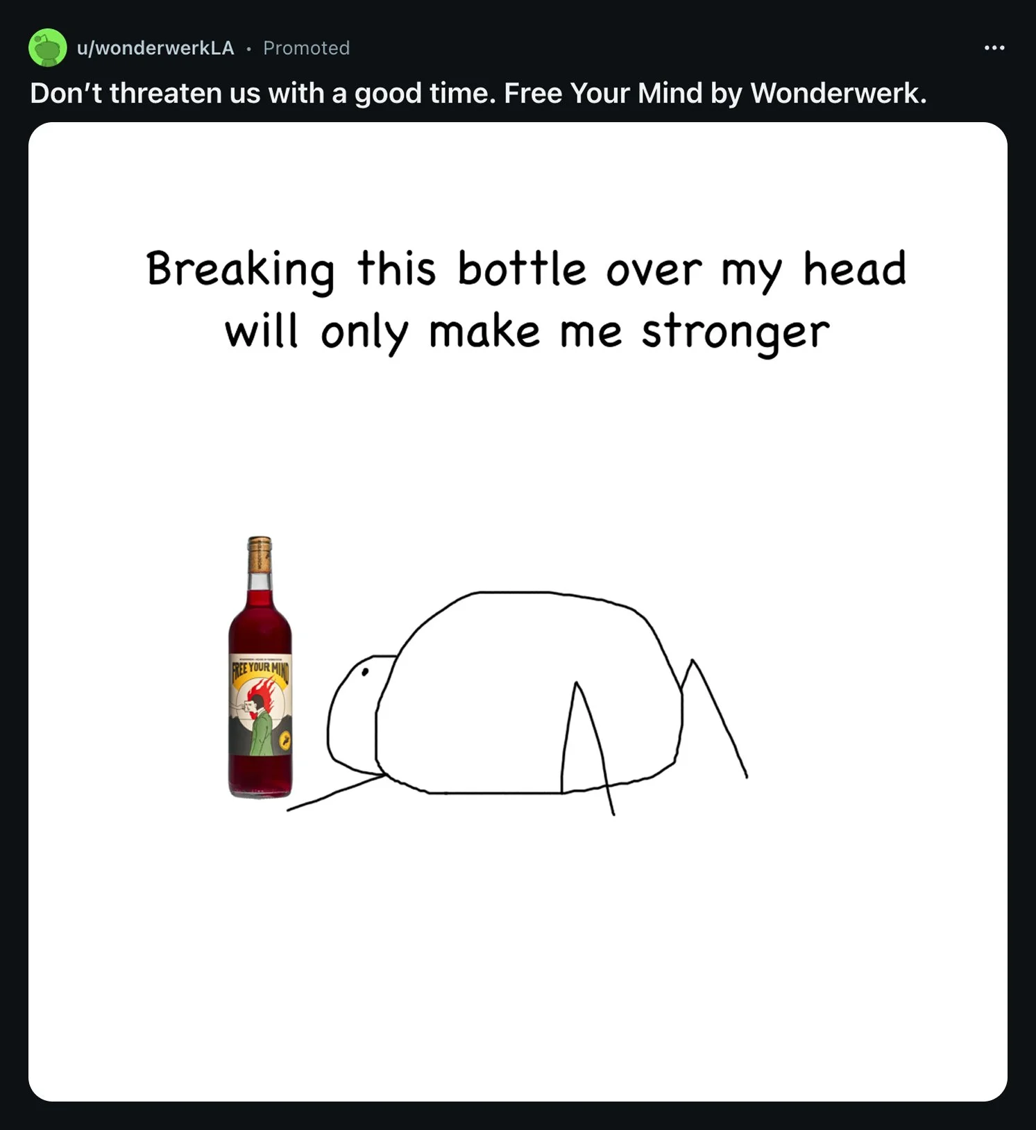 Winemaxxing Reaching Gen Z requires the courage and the will to leave no stone unturned So when Wonderwerk asked us how their wine could reach this elusive demographic, We brought them to r/kitchencels A viral subreddit where people pair their unpleasant anecdotes and recipes. We’ll offer a bottle to the community's biggest strugglers. And do a little maxxing ourselves How else can Wonderwerk get on Gen Z’s page?Lo-fi digital comics: And we’ll bring the latest food trends to wine culture, no matter how profane. Art Director: Lori TsaiArt Director: Monse MunozCBM: Brookelyn ShantlerStrategist: Ivana Wade My contributions: Social copy, comic art, comic copy, and acting.